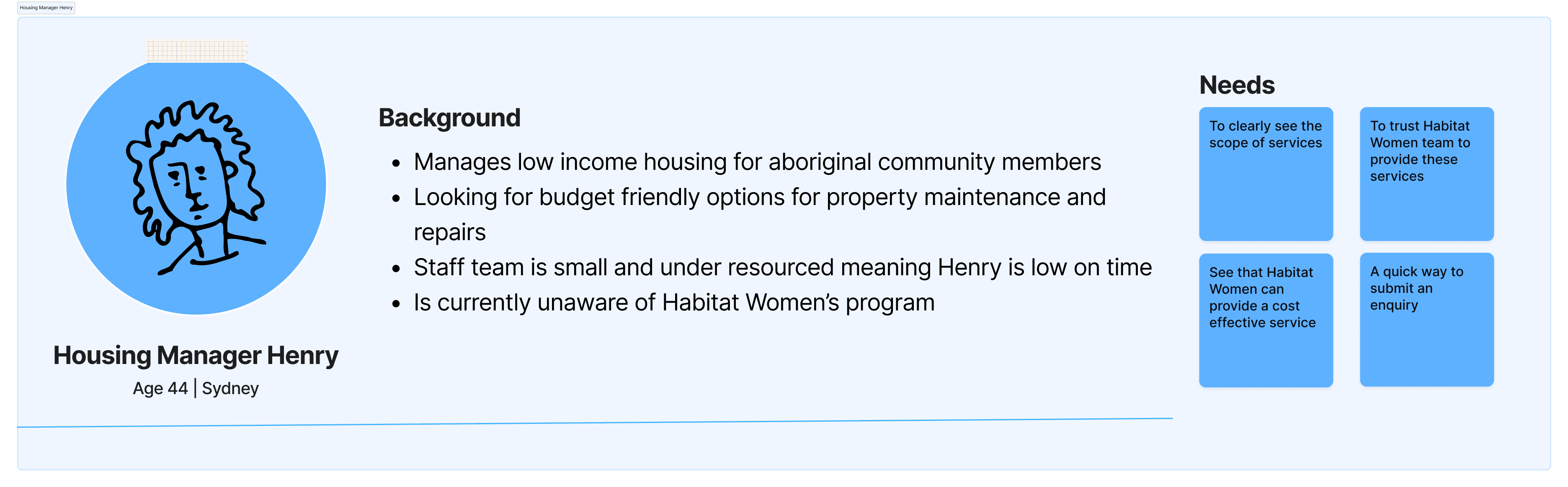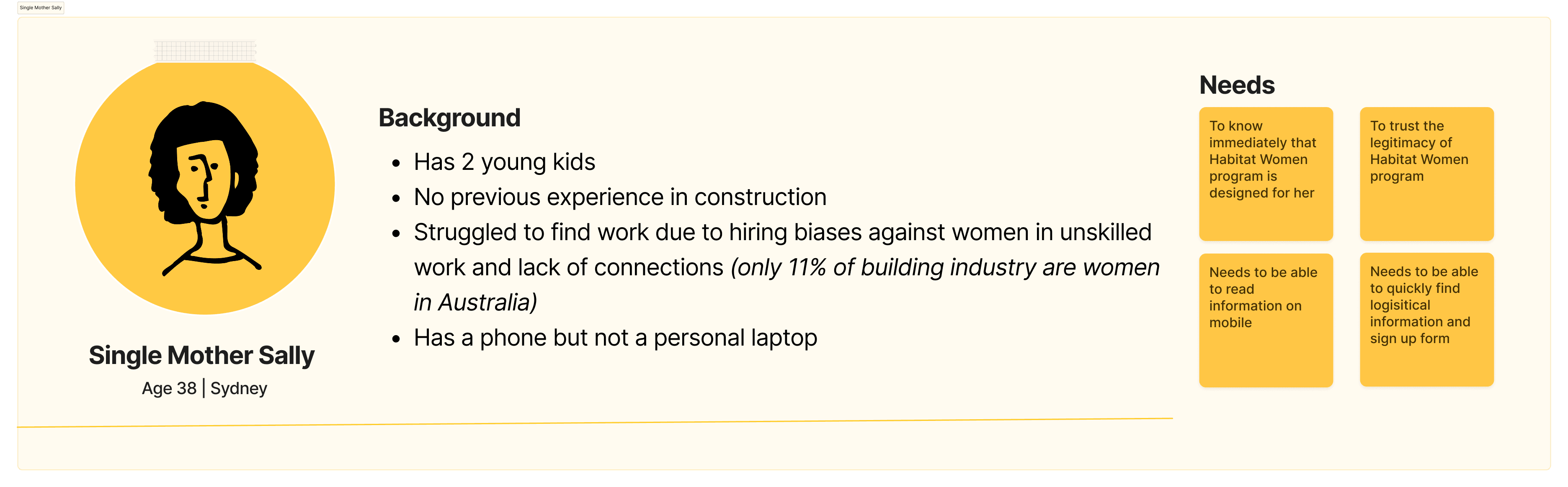 Without direct access to users, I created personas distilled from conversations with staff who worked closely with Habitat Women trainees and a Habitat housing partner (& additional research).